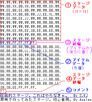 掲示板等で、この形式で公開する事もありますが この際はご自分でファイルを作って貼り付けてください。 拡張子は.hである方が良いでしょう。 BOMBと同じフォルダに置いてください。 なお、以上の操作が出来なくとも、公開まで待っていただければ ステージパックで公開しますのでご安心を。 では、ここからは、詳しい文法の説明をしていきます。 まず、ステージ1はいきなり1行目から始まります。 1ステージは11行で表現されていて 始めの10行は3文字の識別子を10個でステージを 残りの 1行は3文字の識別子を 6個でアイテムをあらわします。 識別子っていうのは、 WW, 見たいなやつのこと。 ステージデータを見るとはじめの行は WW, が10個並んでいることがわかります。(,は行末にもついています) この場合、ステージの一番上はWW,で埋められているということになります。 これが、10個並びます。 最後にアイテムです。 アイテムは5個まで使うことができます。 WW,WW,FF,FF,FF,FF, のように書きます。 これも、WW,が2つ FF,が4つ並んでいます(行末に,がついています) アイテムは、必要なものを書いたら、アイテムの数が6つになるように FF,を埋めないといけないという決まりがあります。 ですから、アイテムが5個でも、FF,は最後に必ず必要です。 ??,??,??,??,??,FF, となるのです。(??には有効な文字が入る) さて、それでは、この識別子ってやつが何を意味しているかを書きましょう。 これさえ覚えば(見ていれば)エディタなしで、ステージを書くことが可能です。 EE, 床 WW, 灰色の壁 BB, 普通のブロック SB, しぶといブロック JJ, 消してはいけないブロック 爆弾 RR, 右矢印のみ LL, 左矢印のみ UU, 上矢印のみ DD, 下矢印のみ RD,(DR,)右と下 RU,(UR,)右と上 LU,(UL,)左と上 LD,(DL,)左と下 HH, 左右 VV, 上下 HD,(DH,)左右と下 HU,(UH,)左右と上 VR,(RV,)上下と右 VL,(LV,)上下と左 XX, 四方向すべて 法則さえ覚えれば結構簡単だと思います。 注意点としては、FF,という特殊な識別子をアイテムのときに使用すること アイテムにはJJ,を使用してはいけないということです。 (無意味ですが、BB,もアイテム使用可能です。) さて、11行のステージは何の仕切りもなくずらーーっとつながっています で、一番最後のステージが終了したら !!,をつけてください。 つけ方は、最後のステージのアイテムの最後、FF,の次の行の頭です。 上の例を参考にしてください。 また、!!,がついた行はこれ以降のこの行の記述を無視しますので ここに作成者の氏名などを書かれてもよいと思います。 そして、!!,の次の行からはコメントが入ります。 コメントは1ステージ1行で、!!,の次の行は1面 次の行は2面と続きます。 なお、2面しかないこの例では 2行目以降、つまり、3行目からは読み込まれることがありませんので こちらに、隠しメッセージを書くなどしてもらっても結構です。 注意事項ですが ステージデータの間違いは許されません。 どこかに間違いがあると、即!読み込みエラーがおきます。 (場合によっては、BOMBがとまります) すべての行末の,を忘れやすいので注意してください。 また、不適切な改行等しないでください。 ステージとステージの間を空けたい気持ちはわかるのですが 絶対にあけないでください。 !!,も忘れないでください。 これが無いと、終端を認識できないので ステージの最後でエラーが起きます。 それに対して コメントのほうはかなりゆるいです。 ぶっちゃけ書かなくても、多分大丈夫です。 一応、ステージの数だけ改行はして置いてください。 |